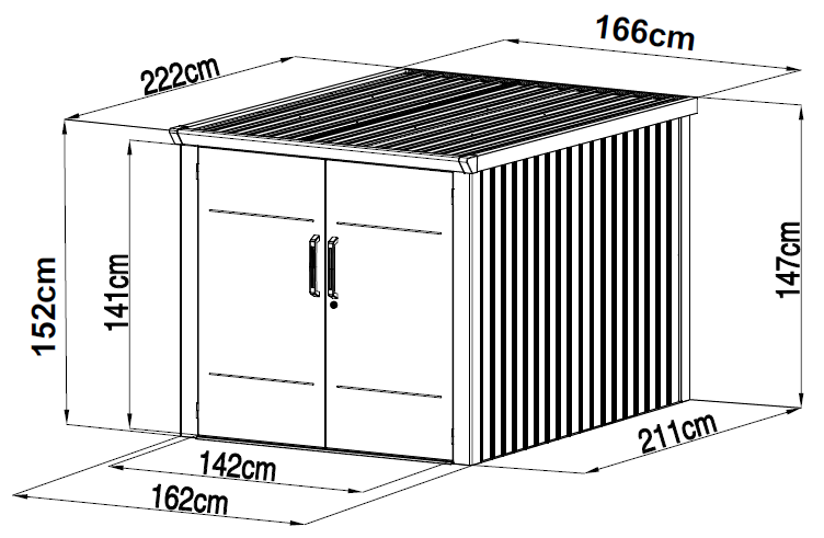 Skříň je vyrobena z žárově pozinkovaných ocelových panelů o tloušťce 0,4 mm a doplněna robustním ocelovým rámem (0,6–1,8 mm), který zajišťuje dlouhou životnost a vysokou stabilitu. Dvojité dveře s bezpečným kombinovaným zámkem umožňují pohodlný přístup a zároveň chrání uložená kola. Součástí konstrukce je také efektivní systém odvodu dešťové vody, který zabraňuje hromadění vlhkosti uvnitř skříně.