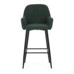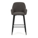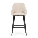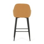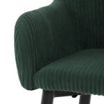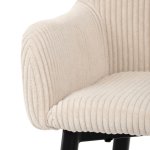Sedák i opěradlo jsou potažené manšestrovou látkou, která nabízí příjemný povrch a výrazné designové prošití dodává židli charakter. Pevná kovová podnož v černém provedení zajišťuje stabilitu a dlouhou životnost. Ergonomicky tvarované opěradlo a integrované područky poskytují komfortní oporu při sezení u barového pultu či vysokého stolu. Židle není otočná, což přispívá k její pevnosti a jednoduchému designu. Je vhodná pro komerční i domácí prostředí, kde je kladen důraz na styl i funkčnost.