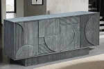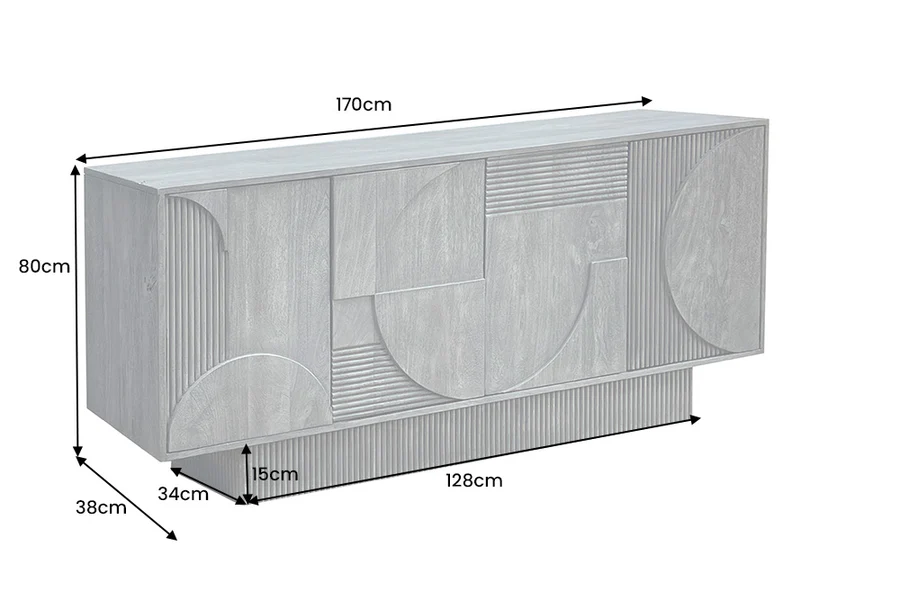 Vneste do svého interiéru luxus a eleganci s komodou ARIADNA, která je vyrobena z masivního mangového dřeva. Její abstraktní 3D přední strana s geometrickými vzory působí jako fascinující ústřední bod každé místnosti. Komoda je k dispozici hned ve třech variantách: přírodní bělená, kouřová a šedá. Díky svým rozměrům poskytuje dostatek prostoru nejen na nádobí a sklenice, ale také na dekorace či další nezbytnosti.