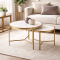 Materiál, z něhož jsou stolky vyrobeny, zahrnuje elegantní ocel s práškově lakovanou úpravou ve zlaté nebo černé barvě, která dodává stolkům pocit luxusu a výjimečnosti. Desky s mramorovým provedením nejen že přidávají na estetické hodnotě, ale také jsou velmi praktické a snadno se udržují.
