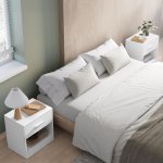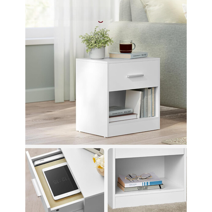 Sada dvou nočních stolků nabízí praktické řešení pro uspořádání prostoru vedle postele. Každý stolek disponuje jednou zásuvkou s jednoduchou úchytkou a otevřeným úložným prostorem pod ní, ideálním pro uložení knih nebo drobných předmětů. Kompaktní rozměry 39 × 27,6 × 41 cm umožňují snadné umístění i do menších prostor.