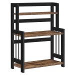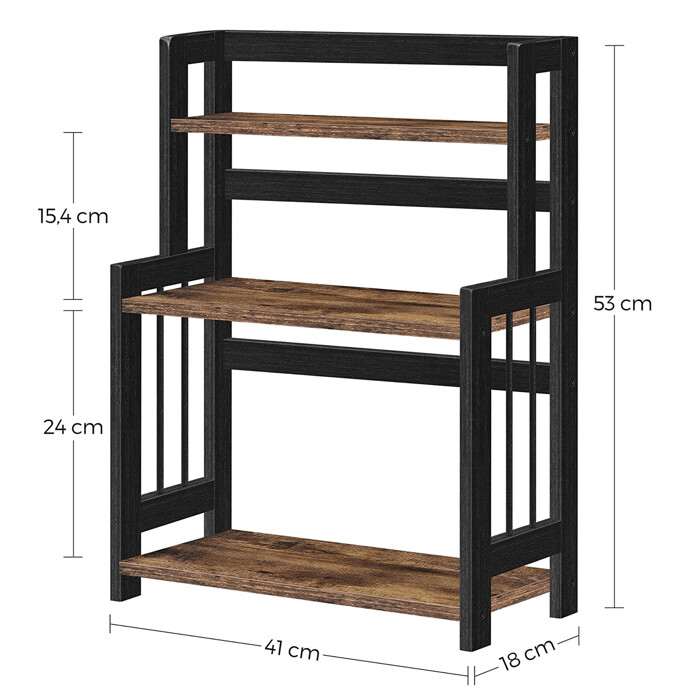 Organizér s třemi patry kombinuje pevný bambusový rám v černém provedení s odkládacími plochami z hnědé MDF desky, které nabízejí dostatek místa pro uspořádání drobných předmětů. Díky kompaktním rozměrům je organizér vhodný pro použití v různých prostorách, jako jsou kanceláře, kuchyně nebo obývací pokoje.