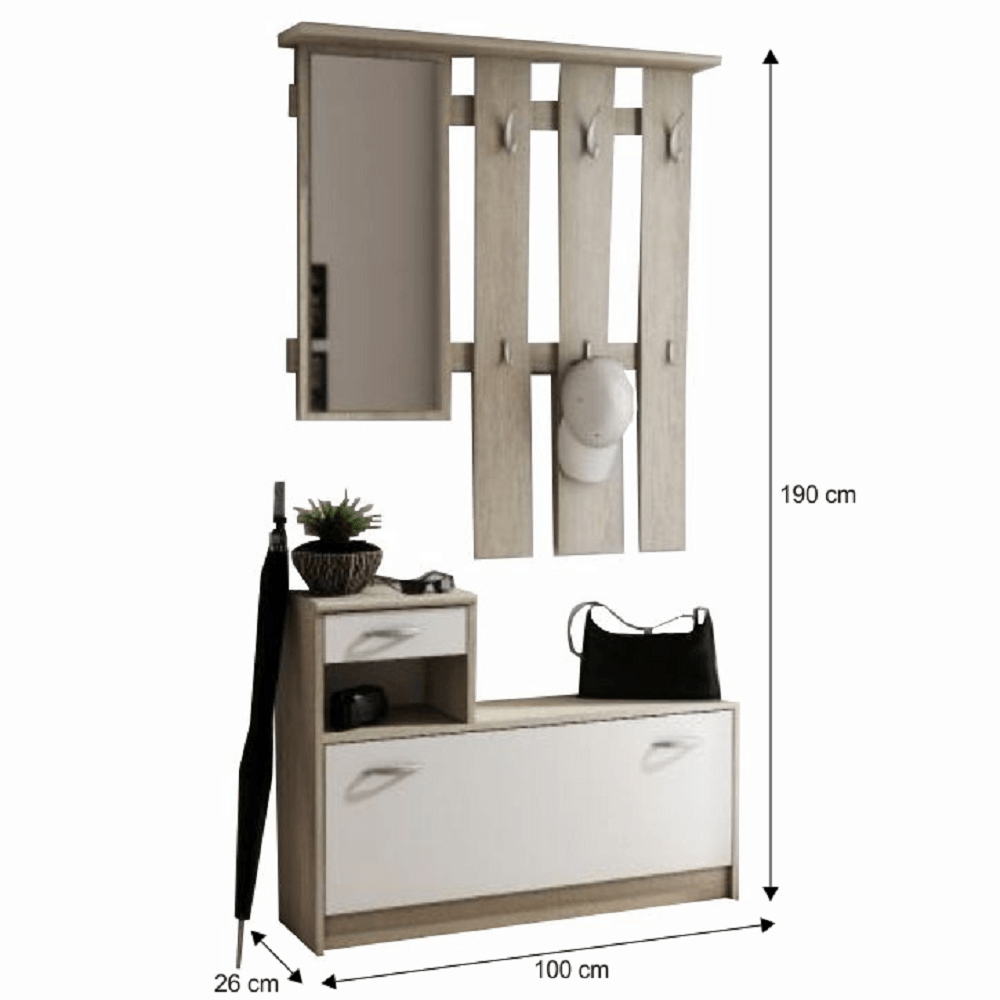 Sestava je vyrobena z kvalitní laminované DTD v kombinaci barev dub sonoma a bílá, která je odolná vůči poškození a zároveň se snadno udržuje. Plastové úchyty a věšáky ve stříbrné barvě dodávají celku elegantní a čistý vzhled. VIRA-MECKI NEW je důkazem toho, že i předsíň může být stylová, funkční a útulná zároveň. Vstupte domů s pocitem pořádku a elegance každý jeden den.
