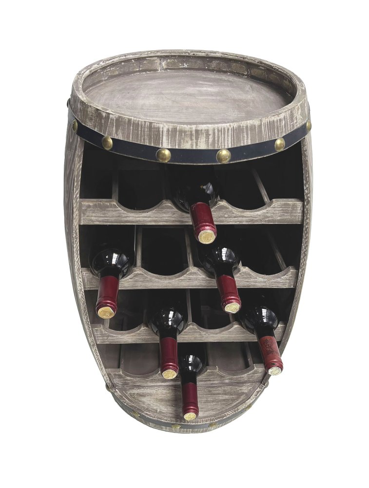 Otevřený úložný prostor pojme až 14 lahví vína. Ať už preferujete bílé, červené, šumivé víno nebo kvalitní šampaňské, každá láhev bude vystavena v té nejlepší formě. Horní část stojanu lze využít jako malý barový stolek pro odložení sklenek nebo drobného občerstvení. Povrch sudu zachovává přirozený charakter dřeva a podtrhuje jeho rustikální kouzlo.