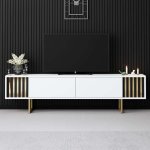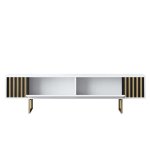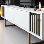 Transformujte svůj obývací pokoj na luxusní a stylový prostor s naším ohromujícím televizním stolkem. Elegantní design a kombinace bílé a zlaté barvy okamžitě pozvednou vzhled vaší zábavní zóny. Tento televizní stolek je vyroben ze 100% melaminem potažené dřevotřísky, což z něj činí nejen krásný, ale také odolný a dlouhotrvající kus nábytku.