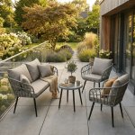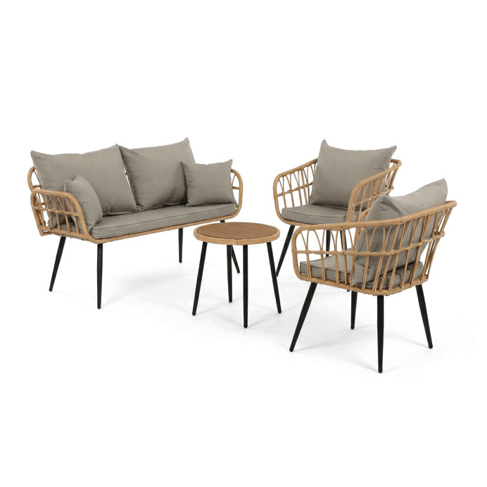 Zahradní souprava AZ-F1508 NAT kombinuje pevnou kovovou konstrukci v černé barvě, odolný umělý ratan (polyratan) a polywoodovou desku stolku určenou pro dlouhodobé venkovní použití. Sestava obsahuje dvoumístnou pohovku, dvě samostatná křesla a kulatý stolek, čímž vytváří plnohodnotný prostor pro relaxaci na terase nebo zahradě.